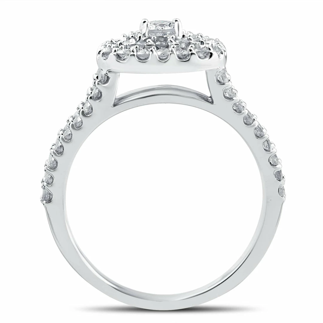 This 10k white gold engagement ring features a 1/5 carat round diamond center stone and accent diamonds. The gorgeous cushion halo diamond engagement ring is complemented perfectly by the white gold wedding band that features the same style of accent diamonds.