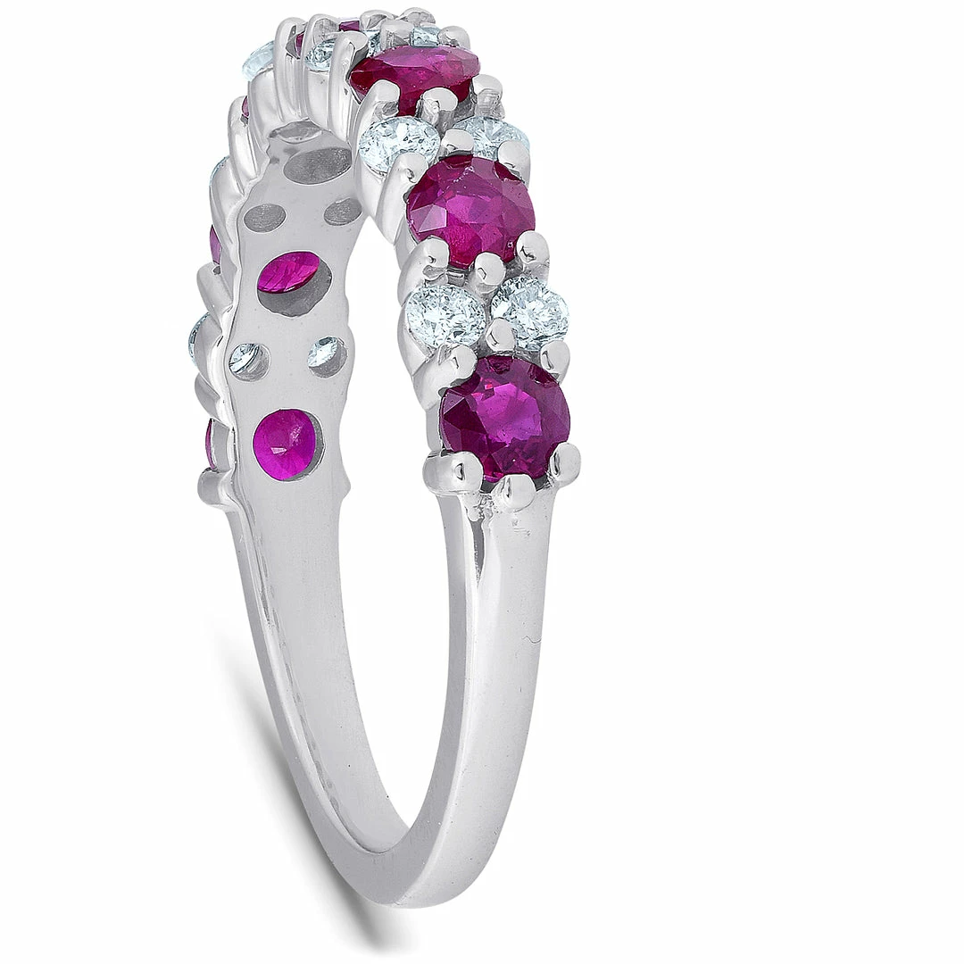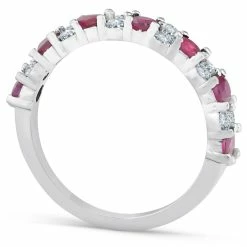 This fashionable and classic women’s ring features 12 round brilliant cut genuine diamonds and 7 round genuine red ruby gemstones. The diamonds and ruby gemstones are prong set. This ring is perfect to match with your engagement ring, wear alone, or stack with other wedding rings.