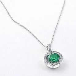 This women’s pendant features one oval 6.5mm emerald and 22 round brilliant cut natural diamonds. All diamonds are set in solid 10k white gold gold. An 18″ 10k white gold clasp lock chain is included.