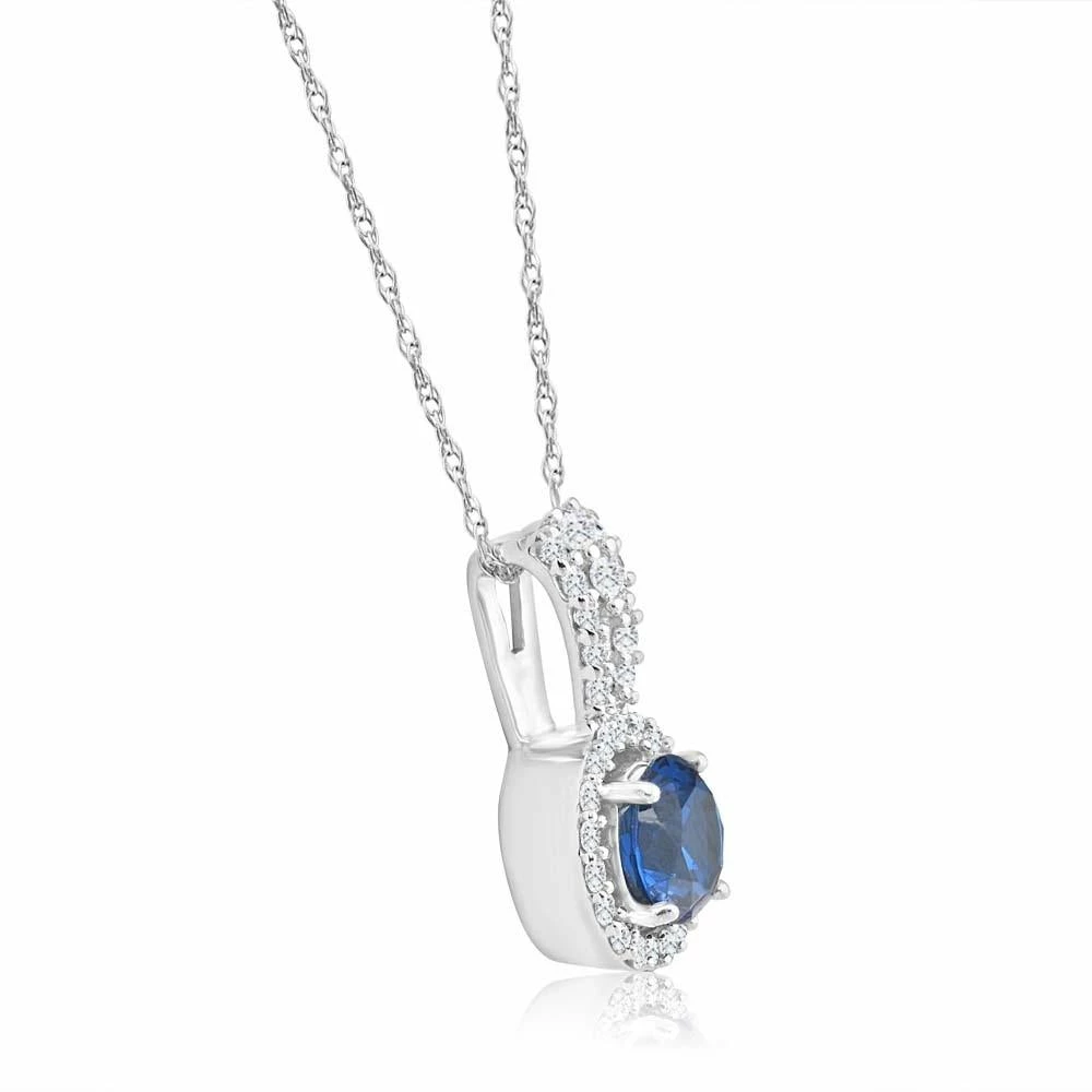 This stunning and classic women’s pendant features 34 round brilliant cut natural diamonds and a 6mm round blue sapphire. All stones are set in solid 10k white gold high polished mounting. An 18″ chain is included.