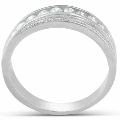 Classic mens wedding ring features 13 round brilliant cut genuine diamonds. The diamonds are channel set in solid 10k white gold high polished mounting. The diamonds are set at an angle and feature a beaded accent to give this classic ring a unique twist.