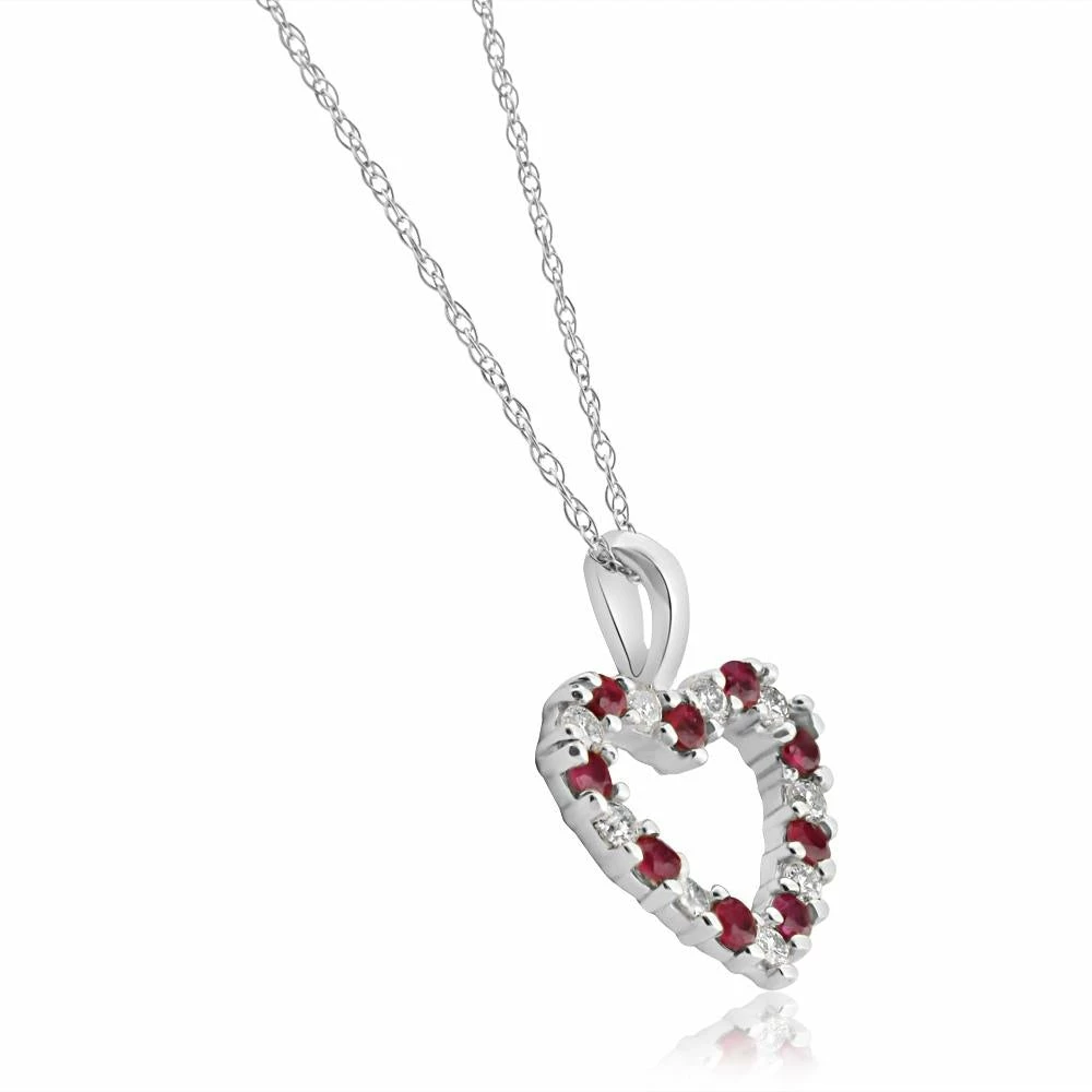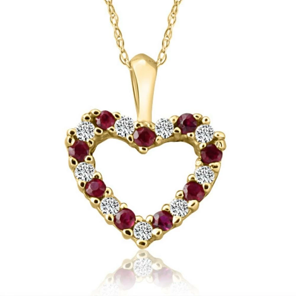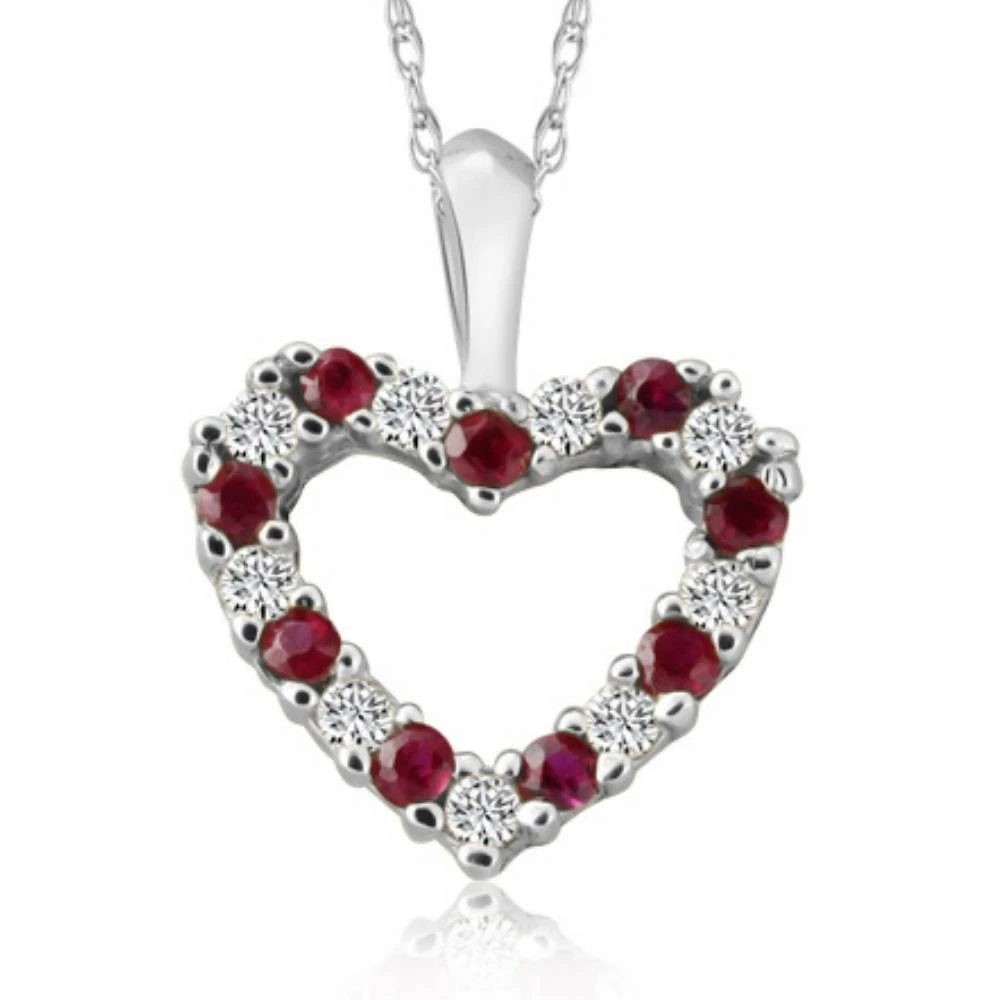This classic women’s pendant features genuine ruby and diamonds alternating in a heart shape pendant. All stones are prong set in solid 10k gold with an 18″ chain necklace.