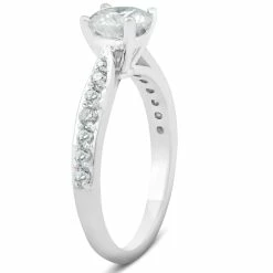 This womens engagement ring features a 1 1/10ct center enhanced diamond and 28 round cut genuine diamonds. All diamonds are pave set in solid 14k white gold high polished classic engagement ring mounting with matching band.