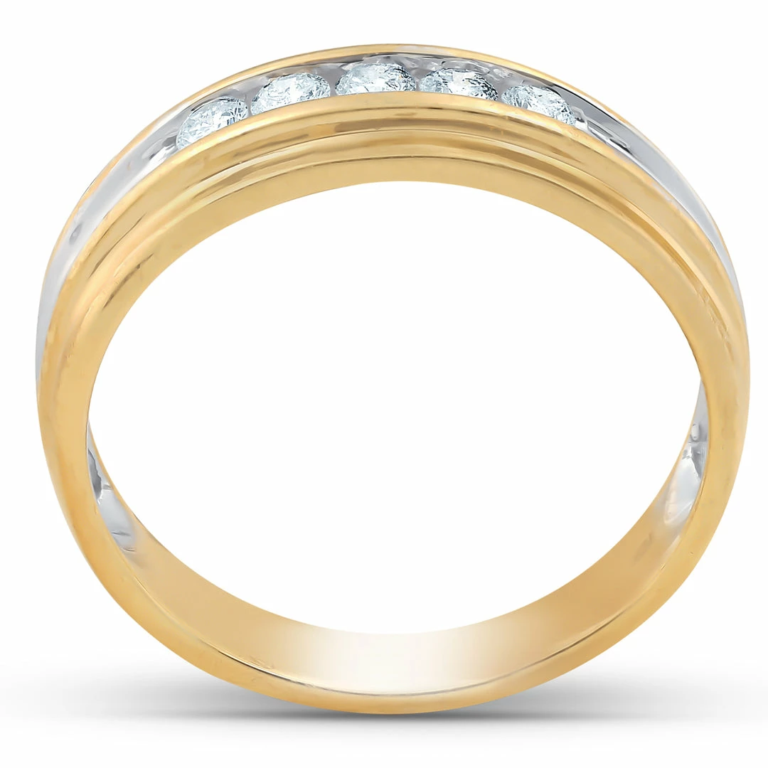 Mens classic and fashionable ring features five round brilliant cut genuine diamonds. The diamonds are channel set in solid 10k yellow gold. The band has a high polished finish.