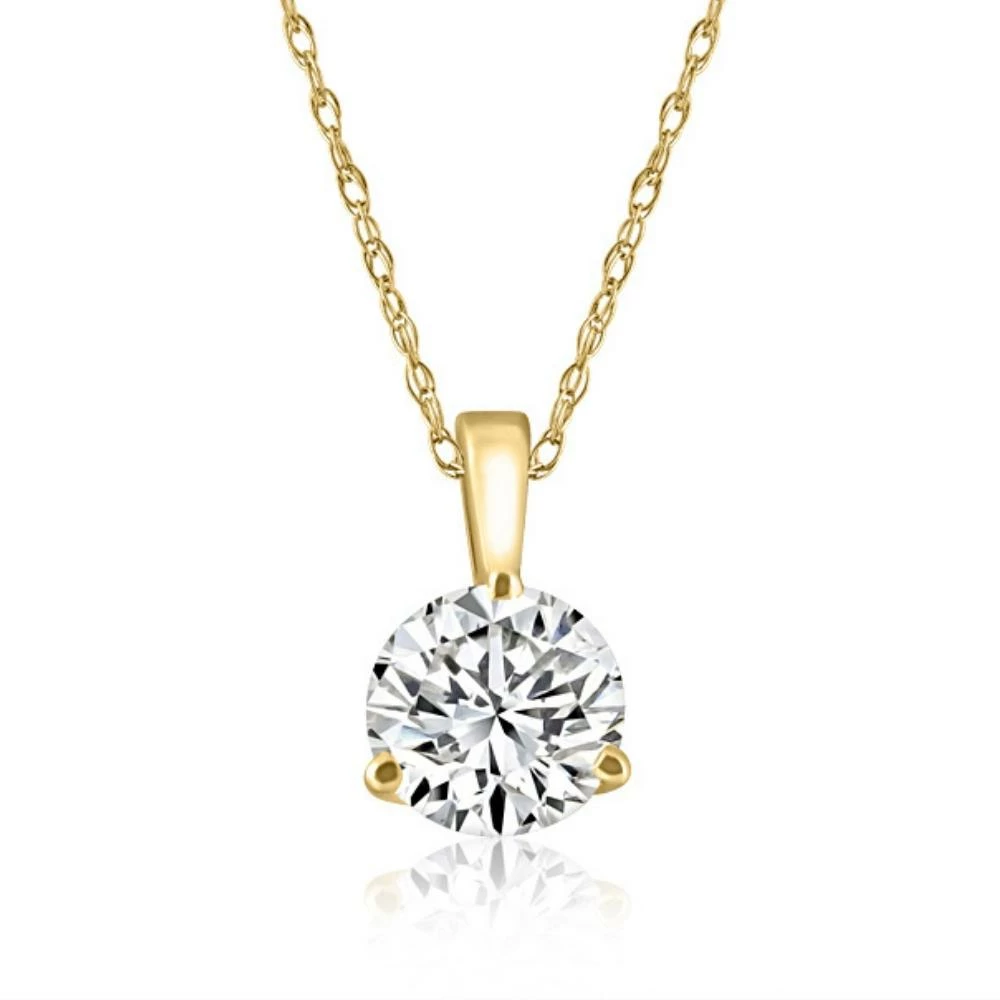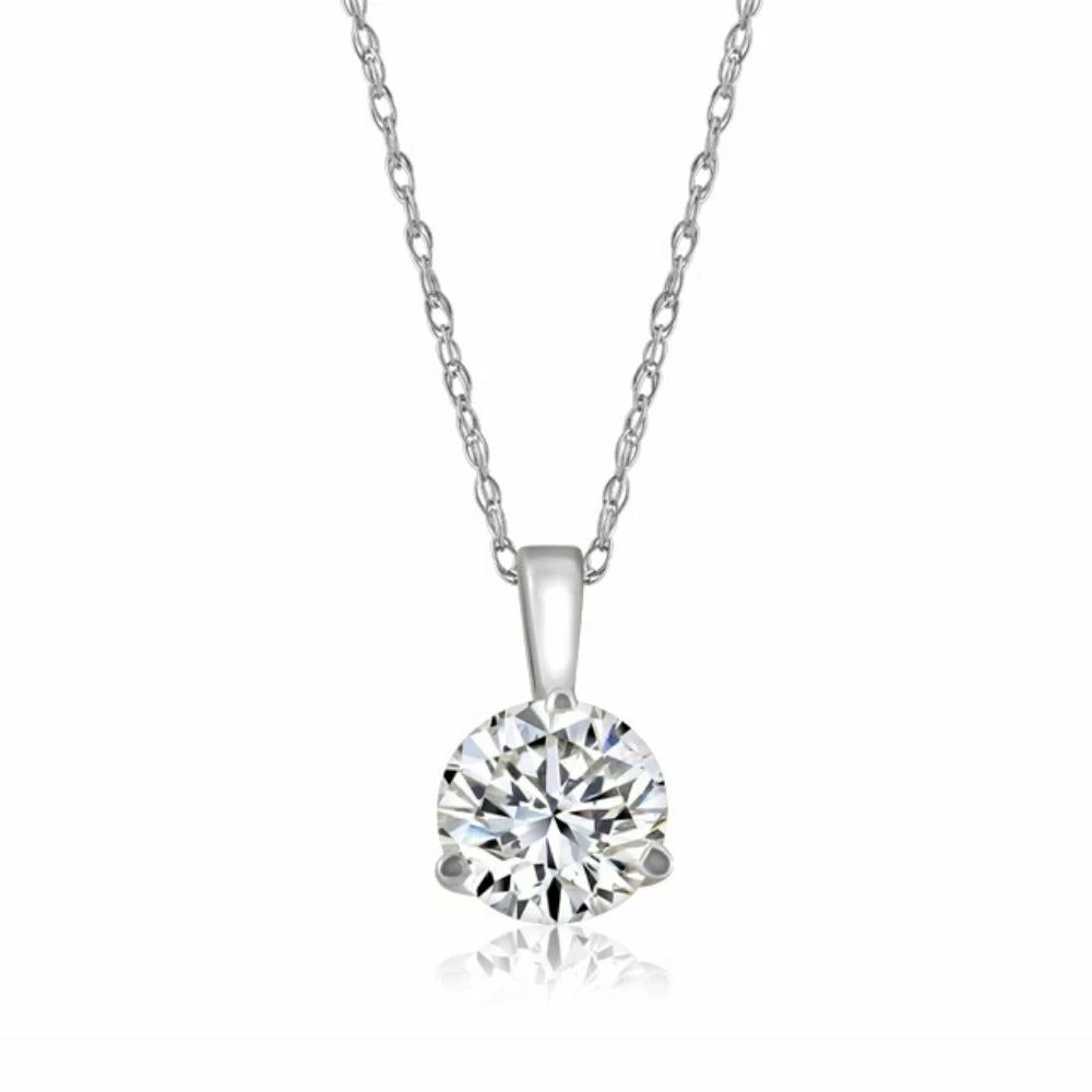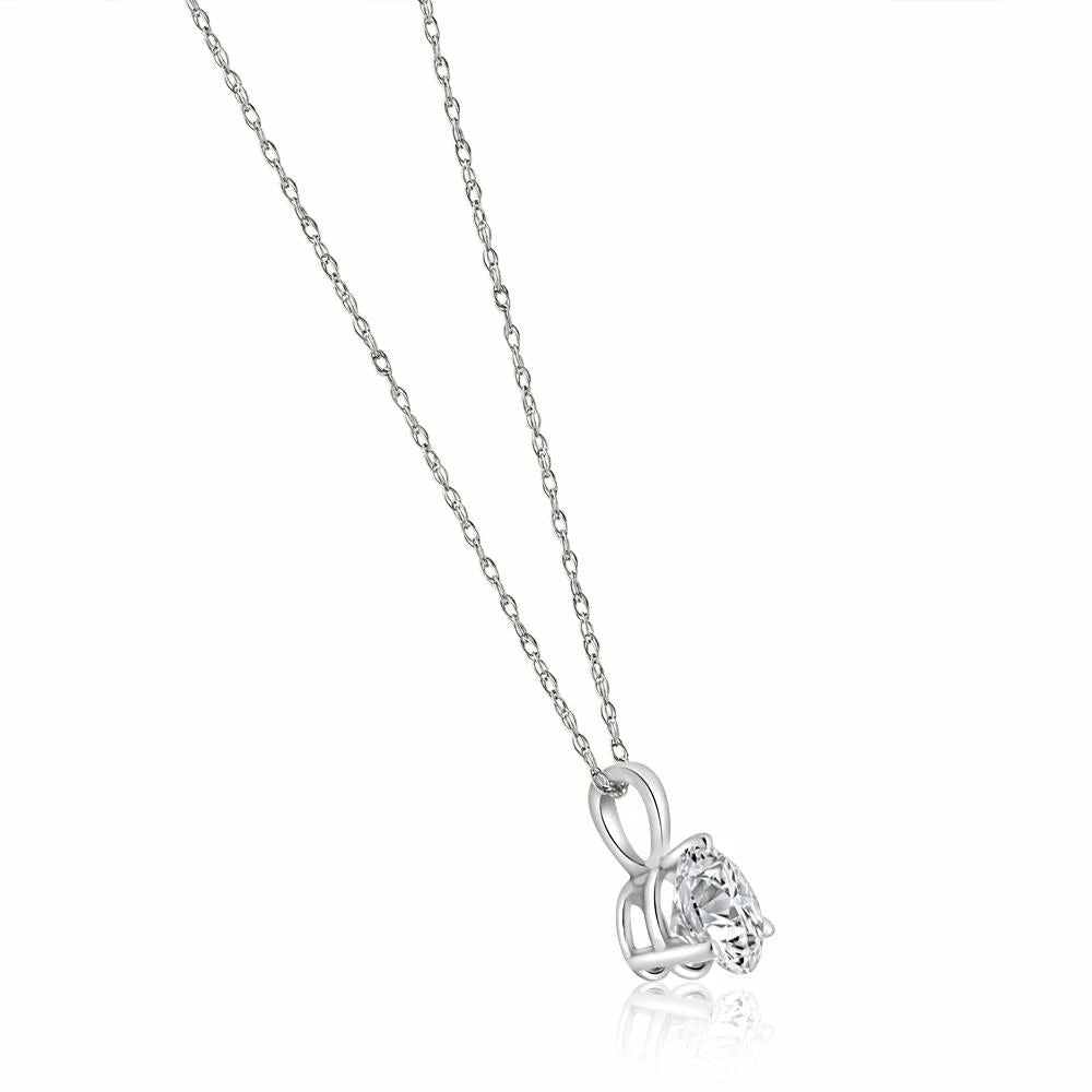 Womens pendant features a lab grown round cut diamond with 18″ spring ring chain.