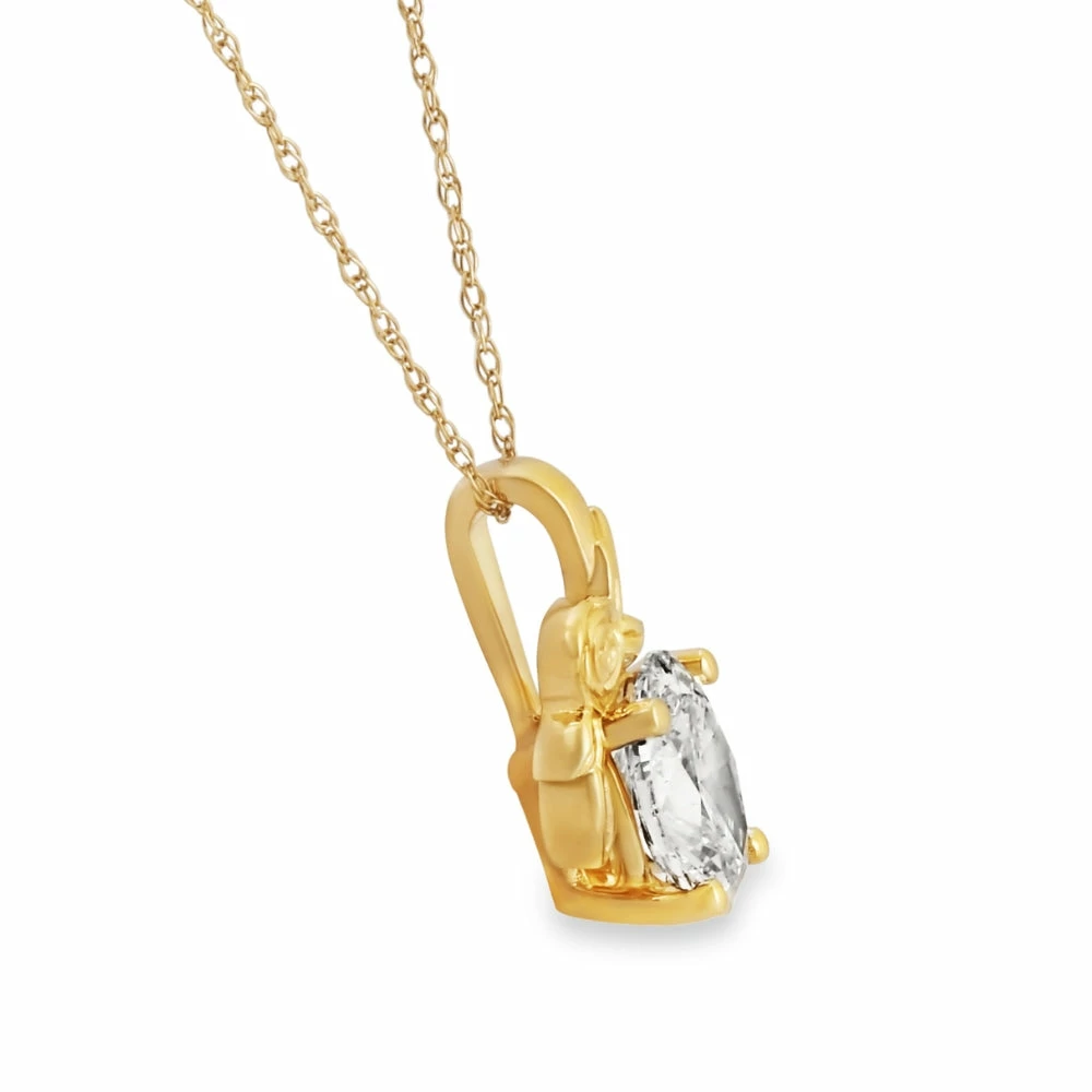 This designer women’s pendant features a genuine 1ct oval brilliant cut lab grown diamond. The diamond is set in solid 14k yellow gold. An 18″ 14k yellow gold chain is included.
