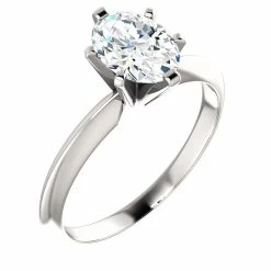Womens ring features a large 8x5mm oval brilliant cut genuine moissanite. The stone is six prong set in solid 14k white gold high polished mounting. The classic setting has a plain high polished band design.
