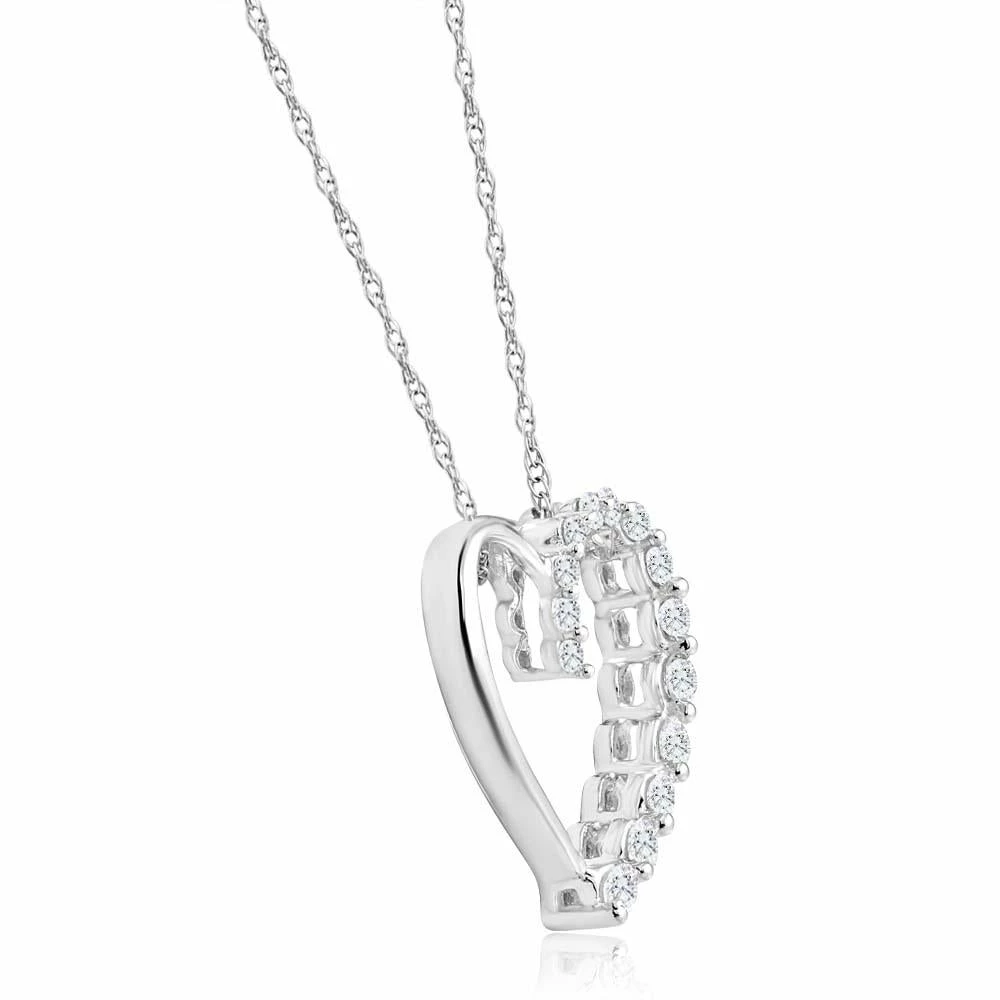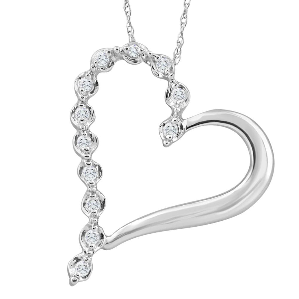 This classic heart shaped pendant features 12 round brilliant cut natural diamonds. All diamonds are prong set in 10k white gold. An 18″ 10k white gold clasp lock chain is included.