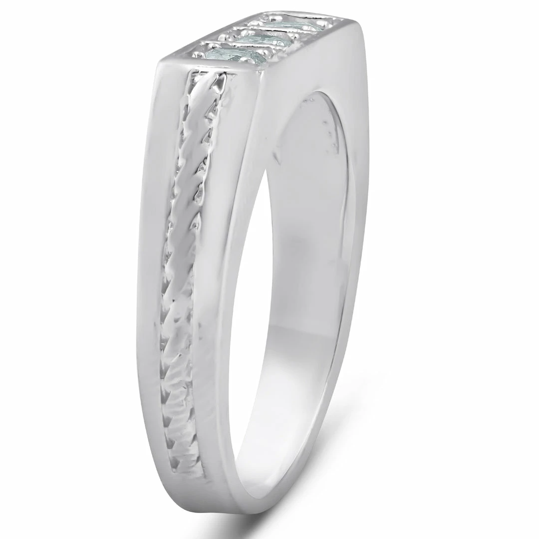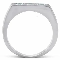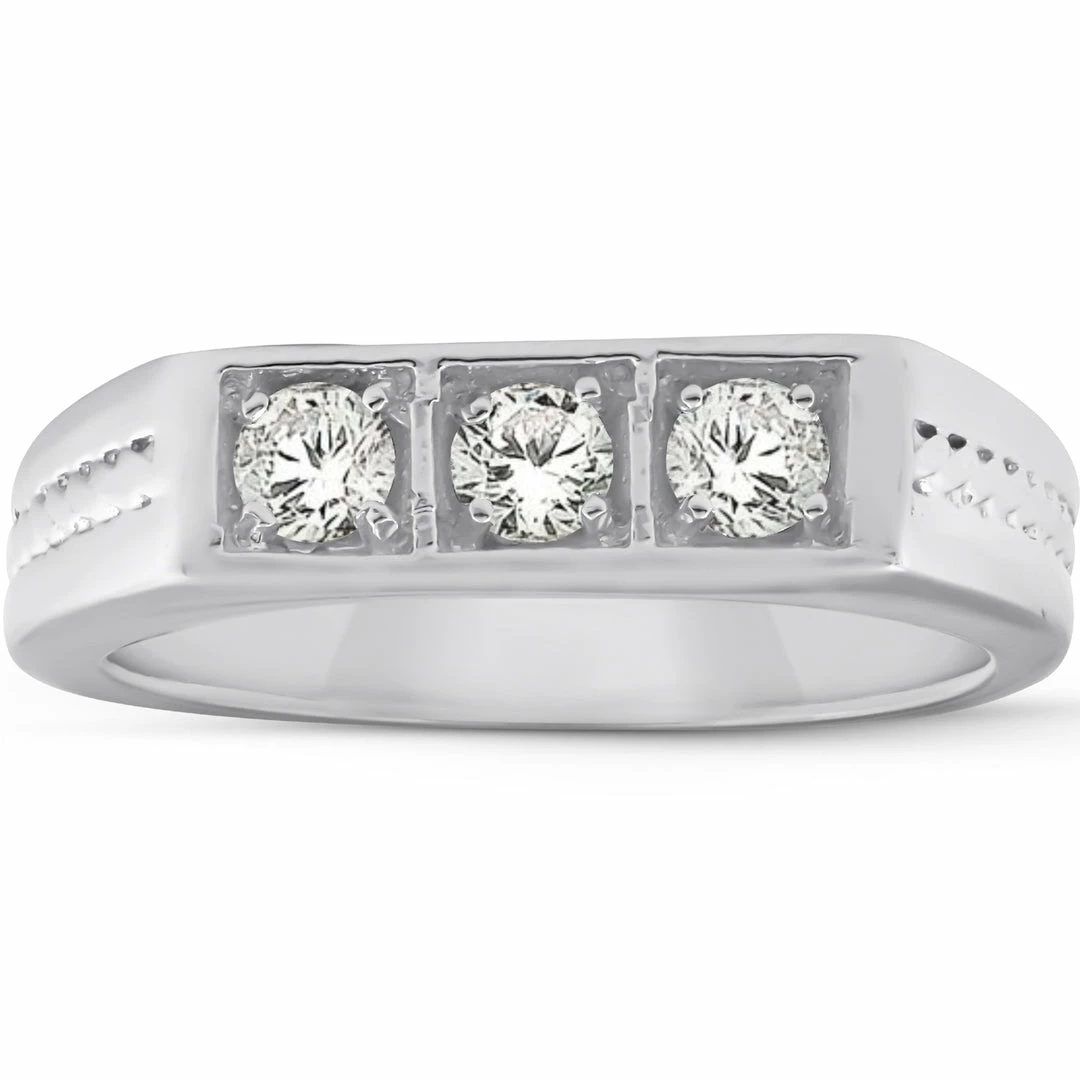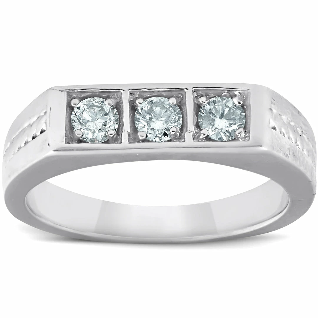 This fashionable and high quality mens ring features three round brilliant cut genuine diamonds. Each round cut diamond is four prong set securely in a solid heavy weight mens 10k white gold mounting.