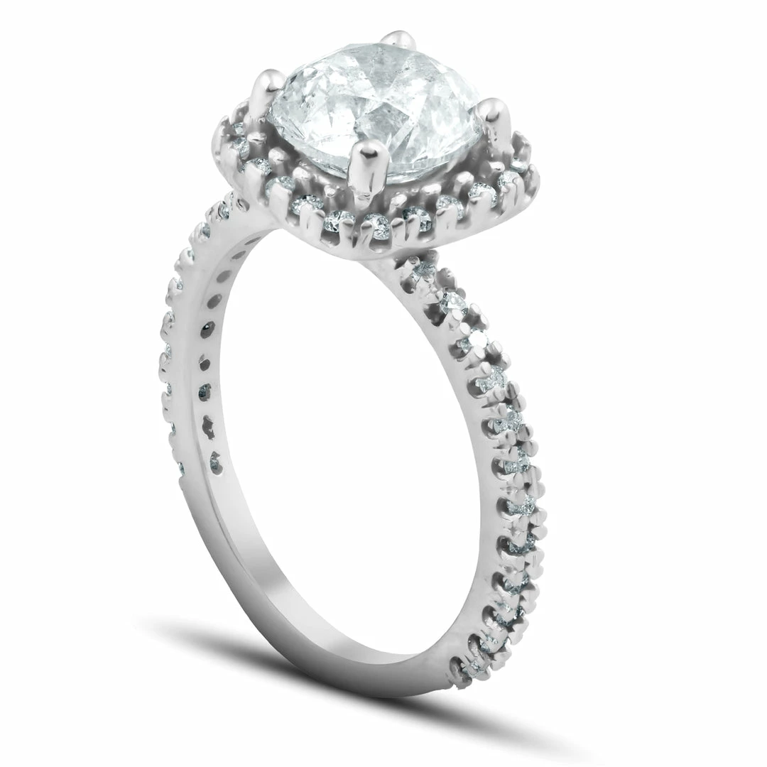 High quality womens engagement ring features a genuine round brilliant cut 2 carat diamond clarity enhanced. The ring is flanked with 38 round brilliant cut genuine diamonds. The diamonds are common prong set in solid 14k white gold high polished mounting. This classic and popular style has flash and clear sparkly diamonds. You will not be dissapointed with the “wow” factor this cushion halo diamond engagement ring has.