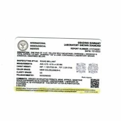 This stunning pair of women’s earrings features two matching round brilliant cut certified lab grown diamonds. Both diamonds are prong set in solid 14k gold with screw backs. Certification is included.