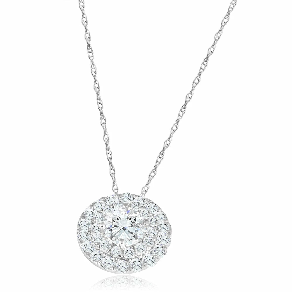 This women’s pendant features a 1ct round cut center lab grown diamond and 32 accent natural earth mined diamonds set in solid 10k white gold with 10k white gold 18″ spring ring chain.