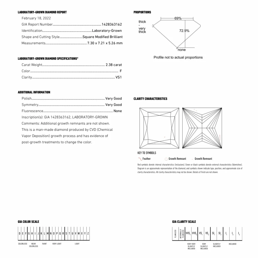 This stunning women’s necklace features a 2.38Ct certified F Color VS1 clarity lab grown princess square cut diamond prong set in solid 14k white gold high polished mounting. The chain is 18″ and features a spring ring. GIA certificate is included.