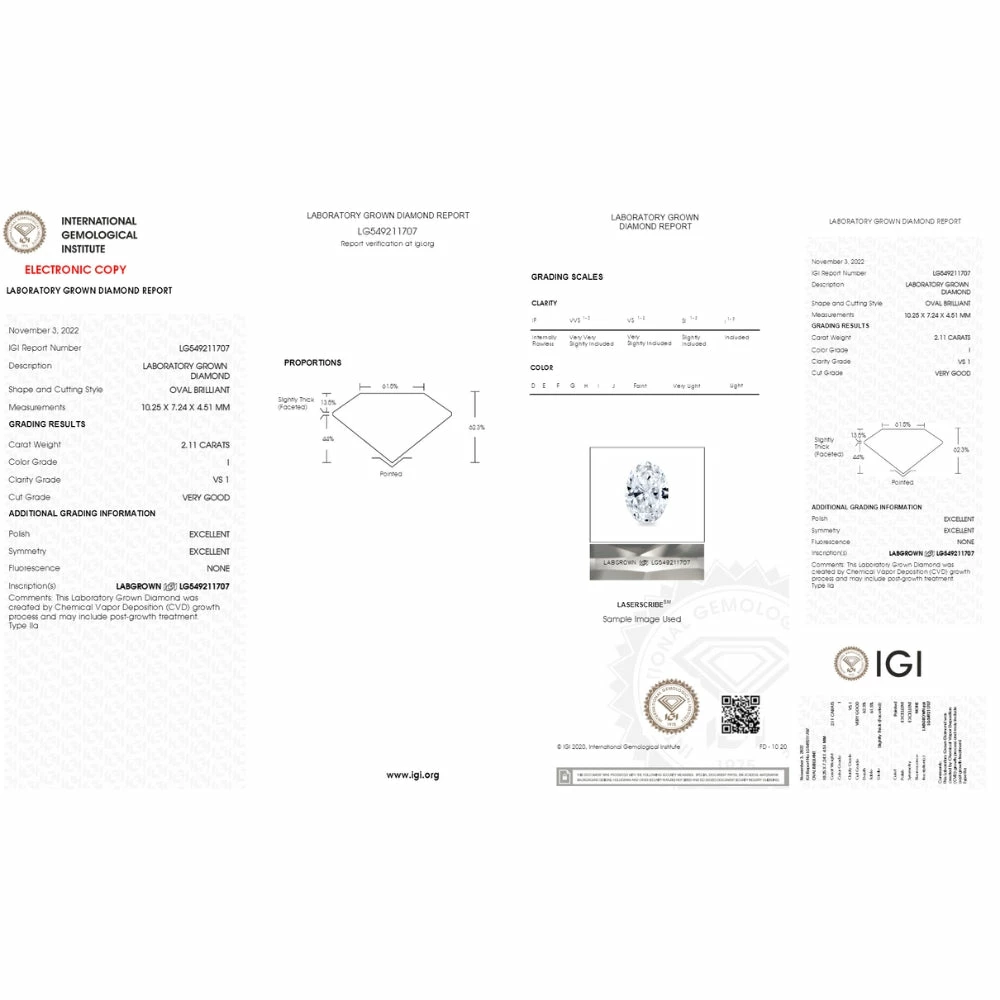 This stunning womens engagement ring features a large 2.11ct oval brilliant cut certified lab grown diamond. The diamond is prong set in solid 10k white gold high polished mounting. Finger size 7 only. IGI certificate is included.