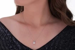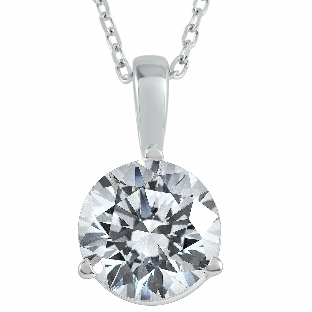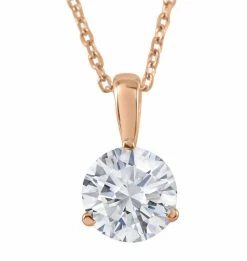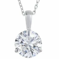 Womens pendant features a 2 carat round cut diamond with 18″ spring ring chain.