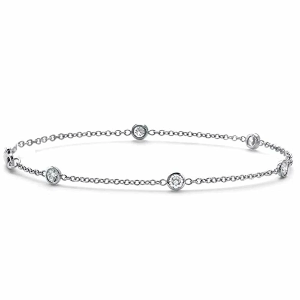 This women’s 7″ bezel station bracelet features six brilliant cut natural diamonds bezel set in solid 14k white gold. The clasp is a double locking securing clasp. 3/4ct total diamond weight.
