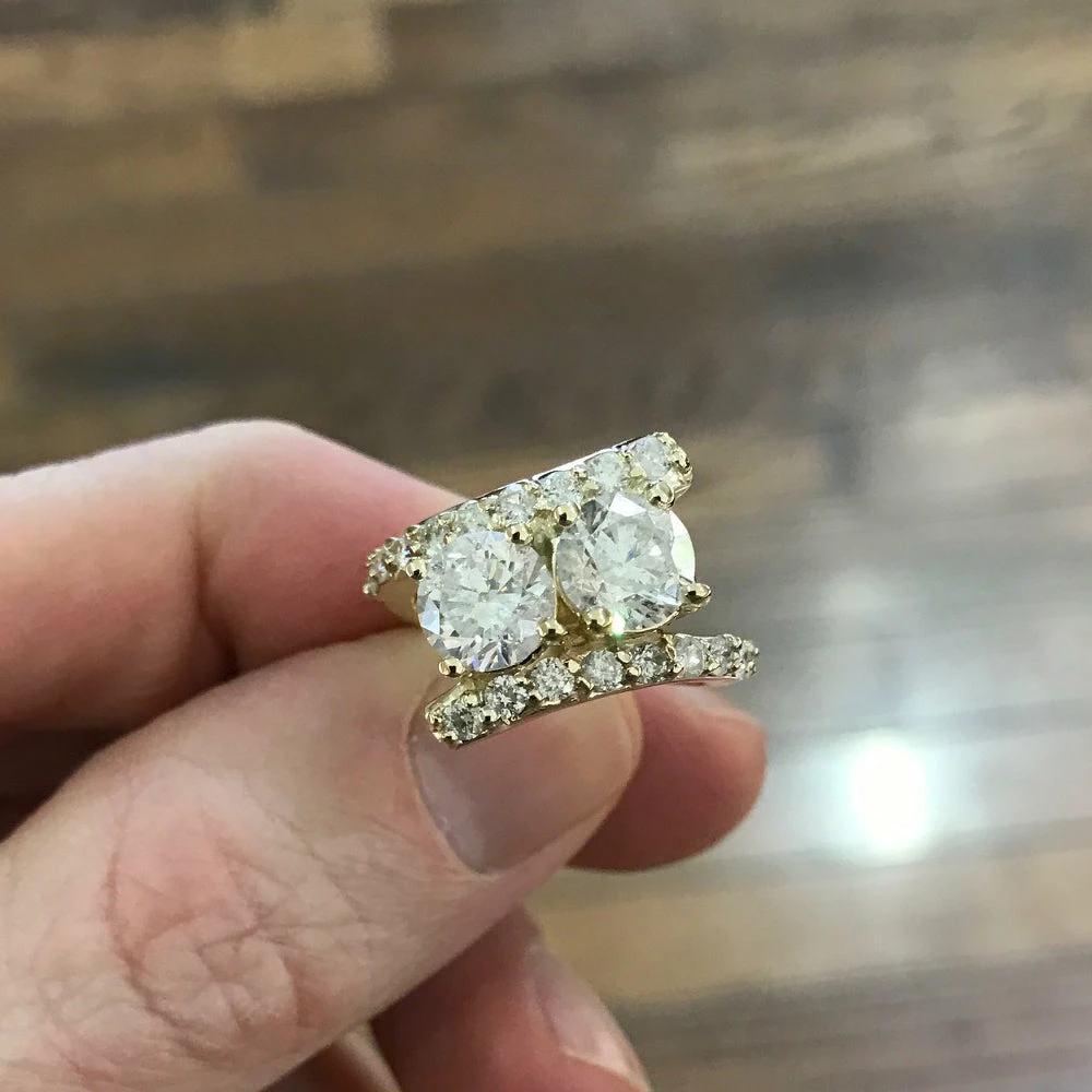 Womens ring set features two 1 1/2ct round brilliant cut genuine clarity enhanced diamonds and 18 round cut genuine diamonds. The diamonds are prong set in solid 14k yellow gold high polished setting.