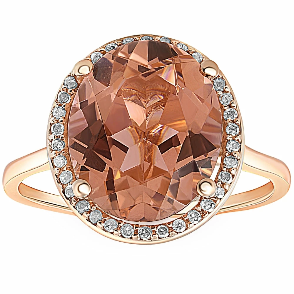 This womens ring features a large 10×12 mm oval simulated morganite gemstone and 34 round cut natural diamonds. All stones are set in solid 14k rose gold band.