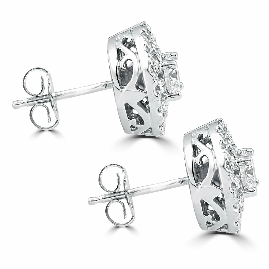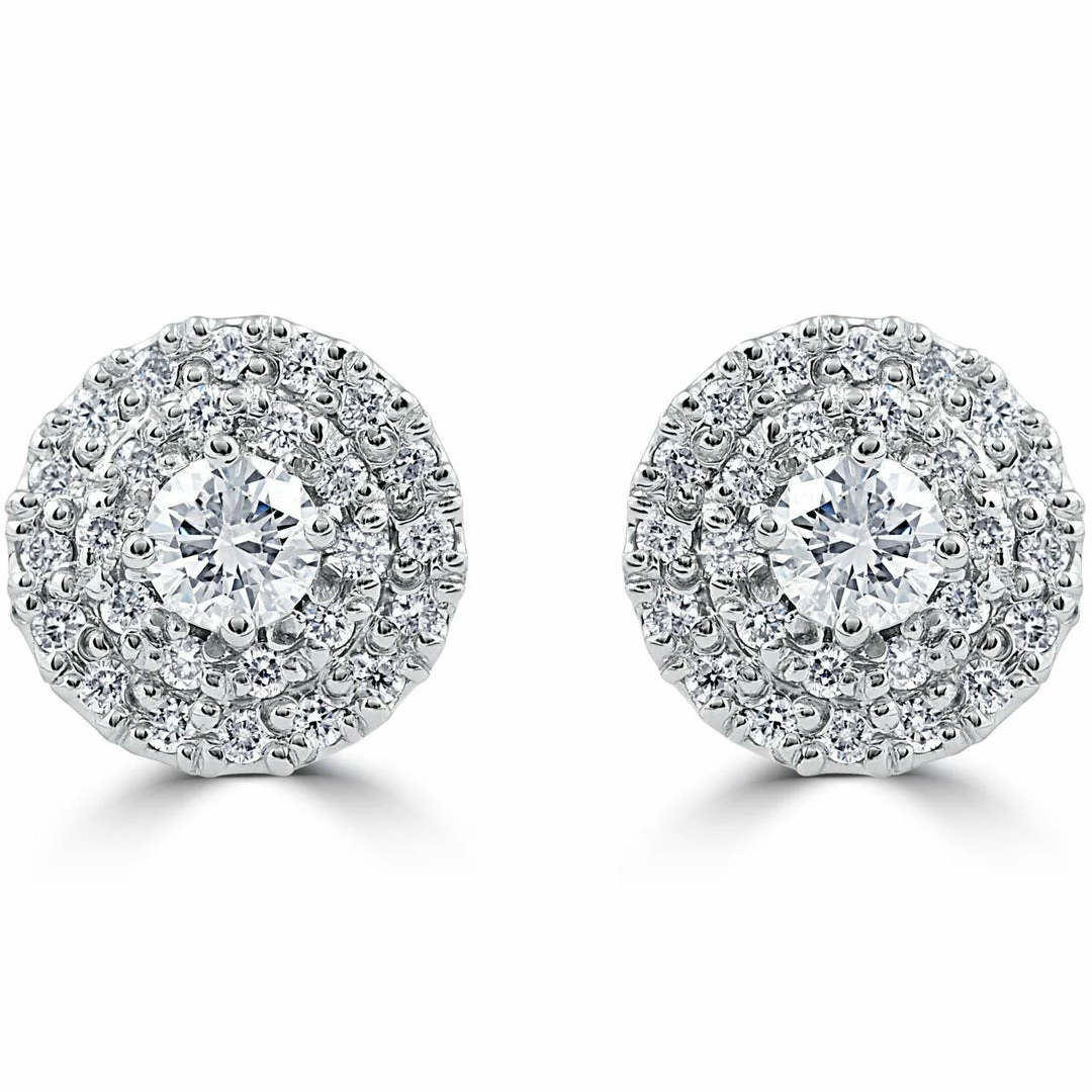 Womens earrings feature two round brilliant cut diamonds that total .44ct, the earrings are flanked with 52 round cut diamonds that total .50ct. All diamonds are set in solid 14k white gold with secure push backs.