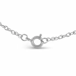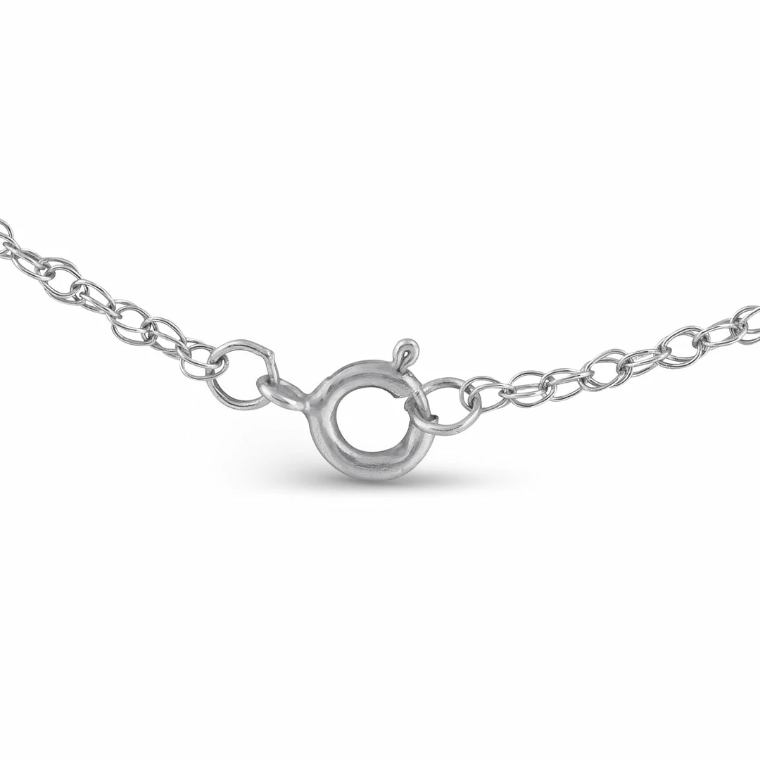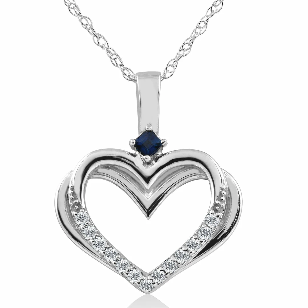 Womens pendant features 13 round cut diamonds and one blue sapphire. All stones are set in solid white gold. An 18″ chain is included. Pendant is 5/8 inch tall.