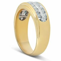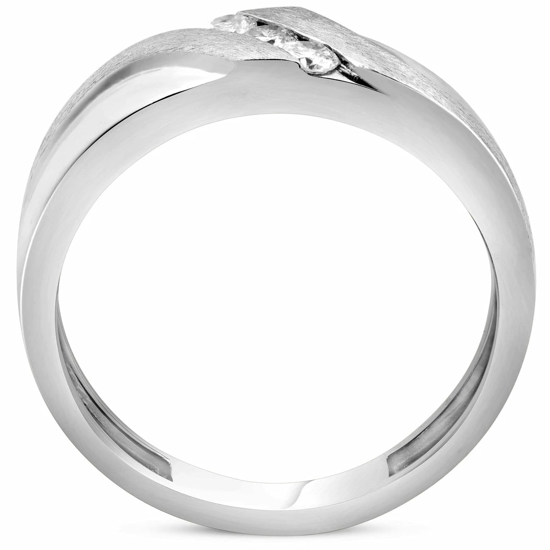 Mens ring features three round cut genuine diamonds. The diamonds are prong set in solid 10k white gold high polished and brushed flat 6.5mm band. This is a classic wedding or anniversary mens ring.